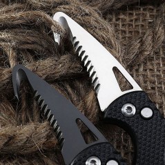 Produsul este prevazut cu o lama zimtata, confectionata din otel inoxidabil, care se pliaza si il transforma astfel intr-un cutit de buzunar.