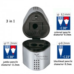 Aceasta ascutitoare tripla are un container pentru reziduuri in ambele parti. Este potrivita pentru creioane grafit si colorate, standard si Jumbo. Are o forma triunghiulara ergonomica si este usor de utilizat.