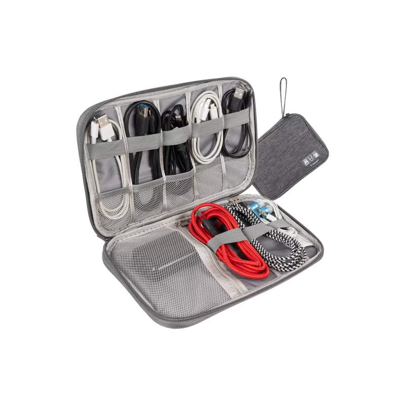 Cu dimensiunile de 24 x 17 x 2,5 cm, organizatorul este compact si usor de transportat in orice geanta sau rucsac. Cele 6 compartimente bine structurate permit organizarea eficienta a cablurilor, incarcatoarelor, bateriilor externe si altor accesorii esentiale, prevenind incurcarea si deteriorarea acestora. Designul sau practic faciliteaza accesul rapid la fiecare articol, economisind timp si oferind un plus de confort in timpul calatoriilor.