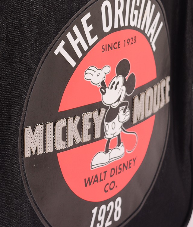 Ghiozdan denim si piele ecologica, imprimeu Mickey, pentru gimanziu