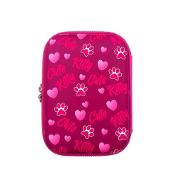 Acest model roz are un imprimeu 3D Cute Kitty, carcasa rezistenta este realizata din material EVA si inchiderea cu fermoar este din plastic cu 2 cursoare. In interiorul compartimentului este o clapeta cu 12 suporturi din banda elastica pe fata si alte 12 suporturi pe verso care fixeaza instrumentele de scris. Penarul are 2 buzunare interioare din plasa, unul are inchidere cu fermoar si dimensiune 20.5x14 cm, iar celalalt are dimensiune de 14x11 cm.