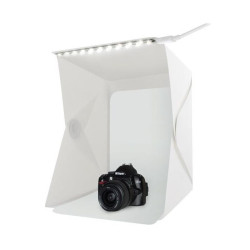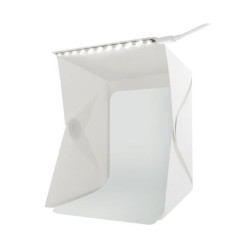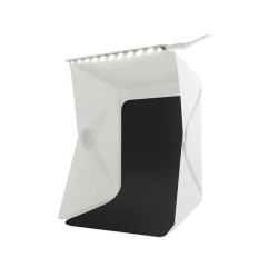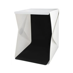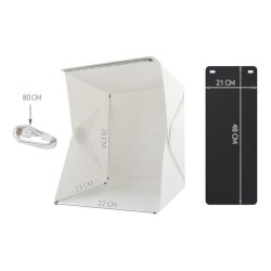 Cubul foto, pliabil, este conceput pentru fotografierea obiectelor de dimensiuni reduse ( de exemplu jucarii, electronice, produse cosmetice, bijuterii, etc). Acesta este prevazut cu 20 LED-uri care emit o lumina alb-neutra iar setul contine 2 fundaluri, unul alb si unul negru, care au scopul de a reflecta lumina si de a impiedica aparitia umbrelor inestetice.
