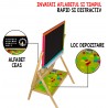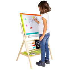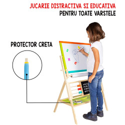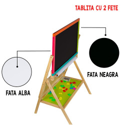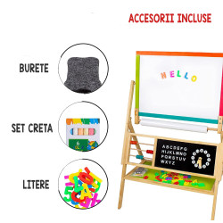Combinarea desenului cu scrierea, crearea si invatarea dezvolta creativitatea si imaginatia copilului dumnevoastra. Prin urmare tablita de scris pentru copii este realizata din lemn de inalta calitate, usor de pliat. Aceasta este prevazuta cu un raft pentru depozitarea accesoriilor. Include un set de alfabet pentru a invata literele intr-un mode creativ si distractiv dar si un ceas pentru a invatarea orelor. Suprafetele sunt rezistente la apa si usor de curatat.