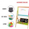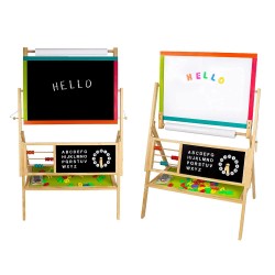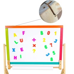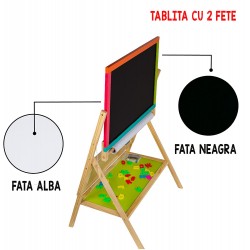 Combinarea desenului cu scrierea, crearea si invatarea dezvolta creativitatea si imaginatia copilului dumnevoastra. Prin urmare tablita de scris pentru copii este realizata din lemn de inalta calitate, usor de pliat. Aceasta este prevazuta cu un raft pentru depozitarea accesoriilor. Include un set de alfabet pentru a invata literele intr-un mode creativ si distractiv dar si un ceas pentru a invatarea orelor. Suprafetele sunt rezistente la apa si usor de curatat.