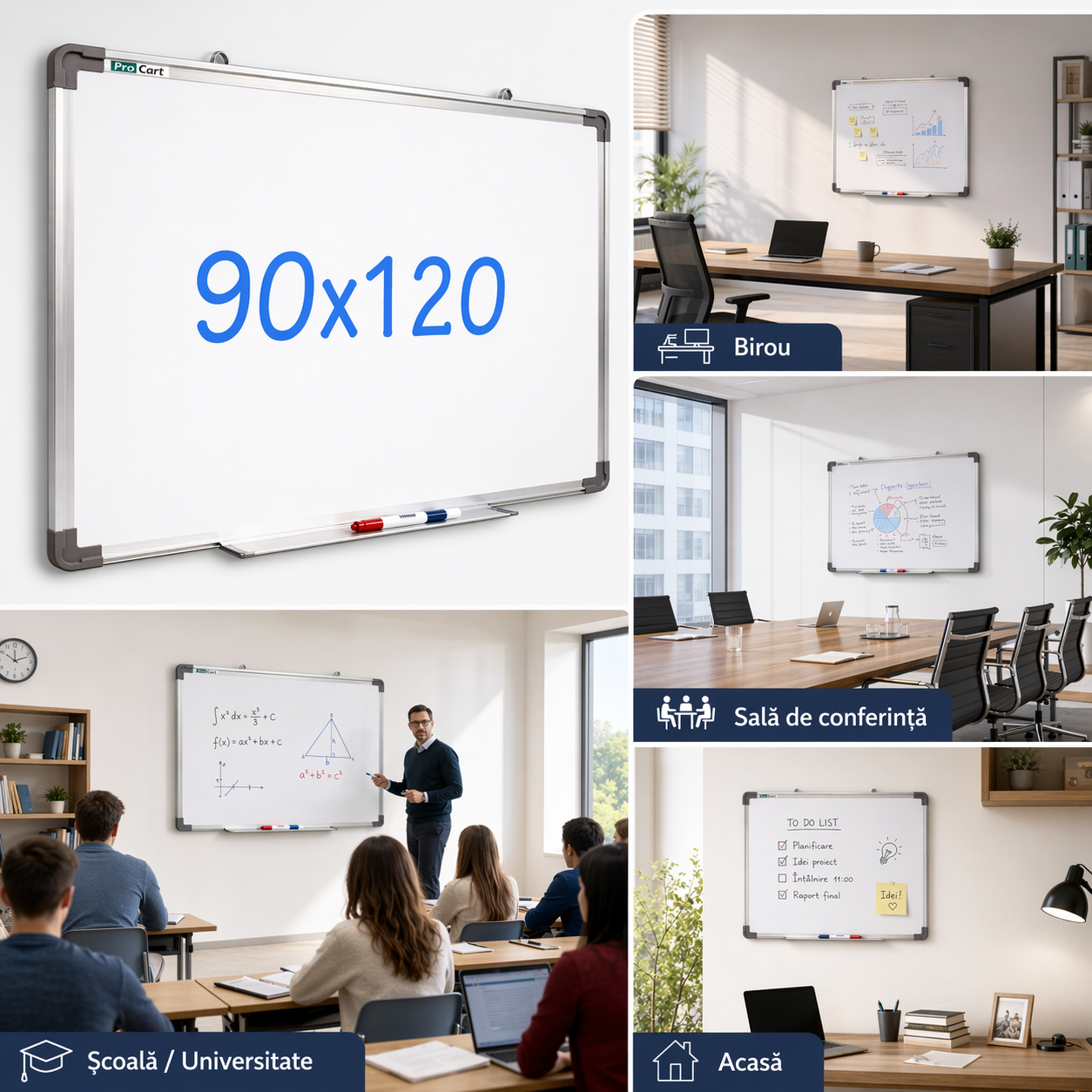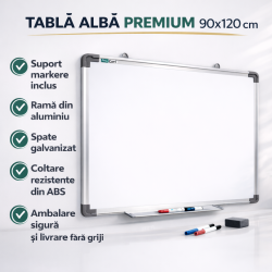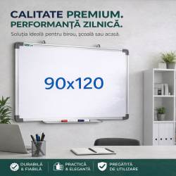 Tabla magnetica 90x120 cm, cu suprafata de scriere tratata special pentru a creste rezistenta in cazul zgarieturilor, este rezistenta la rugina, cadru din aluminiu, colturi rotunjite ce confera o imagine eleganta fiind perfecta atat pentru utilizarea la birou, cat si pentru scoala.